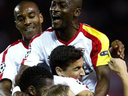 Jesús Navas y compañeros del Sevilla, celebran un gol