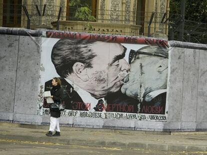 La embajada alemana en España cubre el perímetro de su sede diplomática con una lona que imita el Muro, en el 20 aniversario de su caída