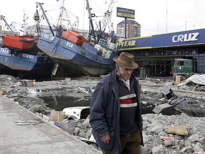 Un superviviente del terremoto camina cerca de varios barcos que acabaron en tierra