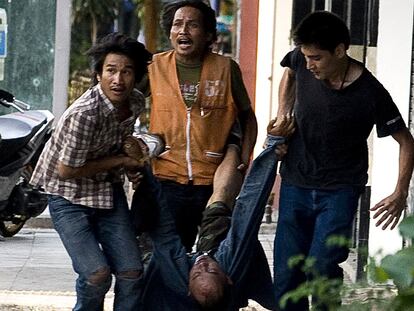 Tres hombres trasladan a un herido