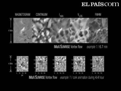 Torbellino observado por el instrumento IMaX: de izquierda a derecha, el magnetograma, una imagen del continuo, el mínimo de la línea espectral, la velocidad del material y la anchura de la línea espectral.