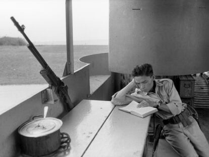 Un marine estadounidense lee en un bote de patrulla por el río Mekong, durante la Guerra de Vietnam
