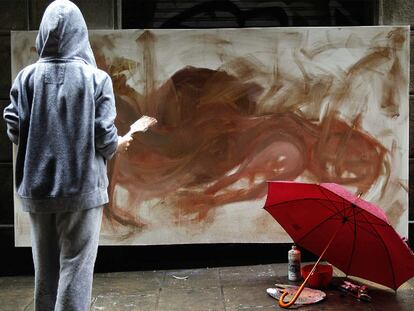 Una artista callejero frente a su lienzo