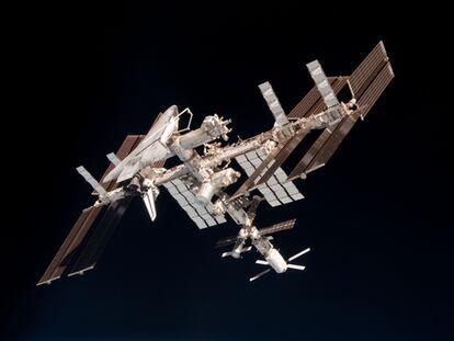 El transbordador 'Endeavour' y la nave de carga Johannes Kepler se distinguen atracadas en la base orbital