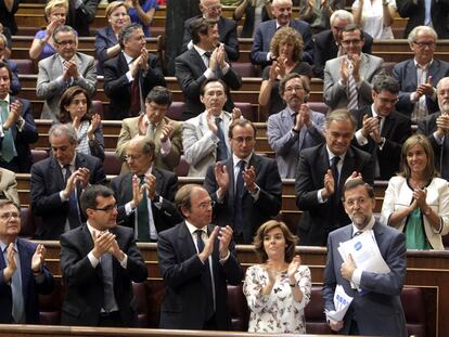 Los diputados del PP aplauden en pie a su líder, Mariano Rajoy