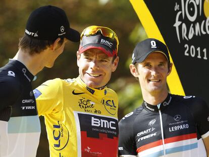 Evans, de amarillo en el podio de París, entre los hermanos Schleck
