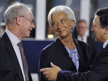 tine Lagarde con Herman van Rompuy y José Manuel Barroso