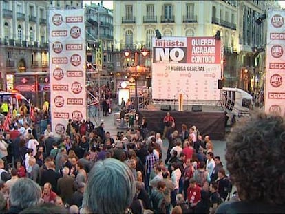 CC OO y UGT se reunieron anoche en la Puerta del Sol de Madrid en una concentración previa a la jornada de paro general