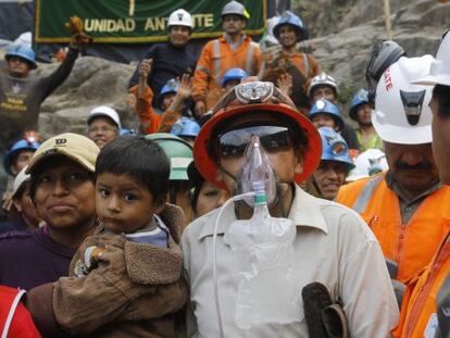 El presidente Ollanta Humala pliega una bandera de su país y la entrega a uno de los rescatados
