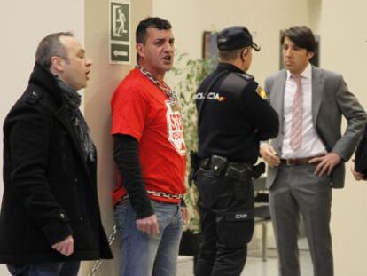 Un hombre se ata a un pilar del Deutsche Bank en Alicante para pedir una solución a su deuda