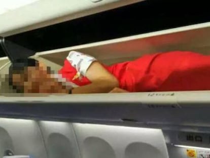 Trabajadoras de la aerolínea son metidas en el compartimento para el equipaje de mano