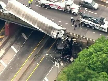Un camión colapsó las carreteras al quedarse colgado de un puente tras un accidente