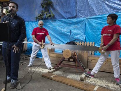 El extraño espectáculo de los Larretxea recorre España Durante el recital, el hijo interpreta sus poesías mientras sus padres talan troncos