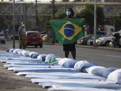 La organización de derechos humanos Río de Paz protestó frente a un hospital en Río de Janeiro contra las crecientes cifras de muertes por covid-19 en el país, que aumentó a más de 3.000 muertos diarios en las últimas 24 horas