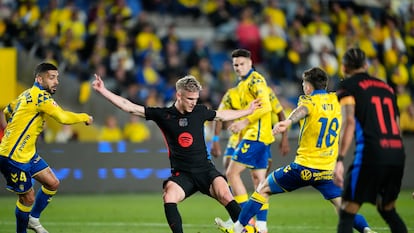 Los goles de Dani Olmo y Ferran le dieron la victoria a los de Flick | El conjunto canario pidió penalti por mano de Eric García, pero había fuera de juego previo