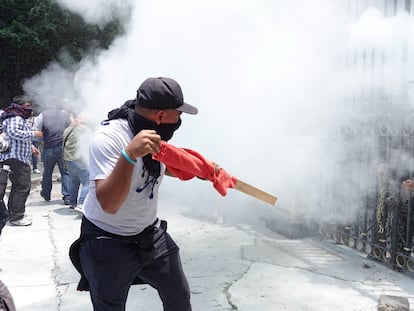 Algunos de los protestantes tratan de entrar al edificio, mientras que la policía responde con gas disuasorio desde el interior