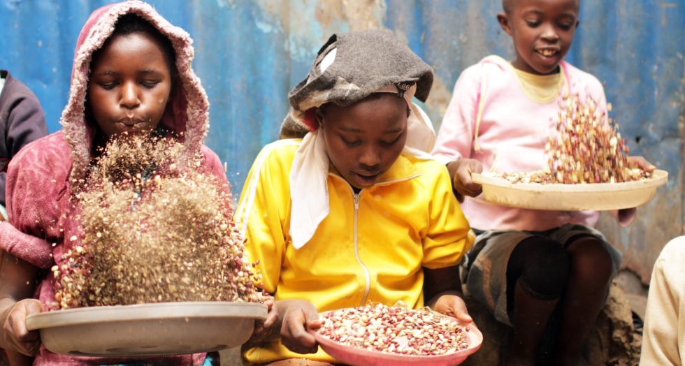 Nyachot displays a handful of maize grains that form part of the food ration she receives in World Food Programme restored full rations in January, but the funding situation remains uncertain and WFP ...
