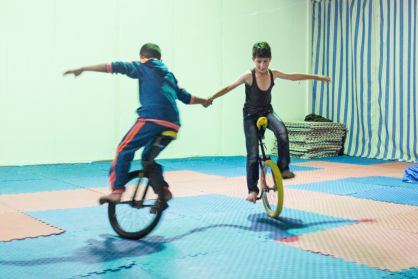 Jóvenes sirios entre 14 y 25 años aprenden ejercicios acrobáticos en el campamento de refugiados de Zaatari. Un intento por recuperar su autoestima