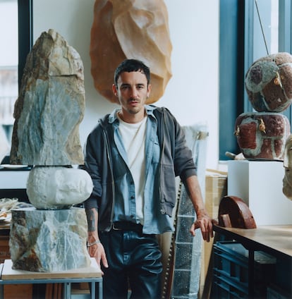 Si no fuera por sus tatuajes —el que lleva plantado en medio del cuello reza “sentimental”—, Théo Mercier podría pasar por un bello poeta salido del París decimonónico. En su porte hay una melancolía romántica que contrasta con la crudeza de una obra guiada por la idea de un apocalipsis suave, de un fin del mundo silencioso, al que tal vez ya asistamos sin darnos cuenta. El artista nos recibe al final del verano en su estudio, no muy lejos del cementerio de Père Lachaise. El espacio, diáfano y depurado, parece más una galería de arte que un taller: las paredes blancas, los suelos de cemento pulido y las largas mesas de trabajo revelan un orden casi quirúrgico. En estanterías minimalistas se alinean esculturas, fósiles, piedras, conchas, fragmentos de cerámica y otras reliquias encontradas en mercados o montañas. La luz que entra por los ventanales se posa sobre cada superficie, dibujando las grietas y relieves, revelando la textura de las cosas, la historia que se esconde en cada objeto.