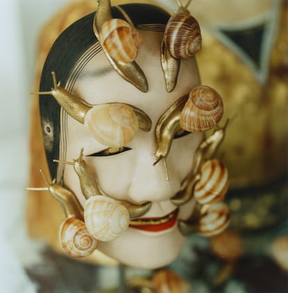 Estamos en tiempo de descuento para el otoño y a Mercier no le sobran las horas, aunque se muestre afable y disponible: acaba de tener un bebé y debe marcharse en breve hacia Riad, donde prepara una obra monumental en pleno desierto saudí, sobre un terreno de 2.000 metros cuadrados, quizá el proyecto más ambicioso y exigente de su carrera. A nuestro alrededor, detectamos un sinfín de caracoles modelados y pintados a mano. Forman parte de su nueva exposición, I Swallow Your Tears, que presentó en la galería Mor Charpentier de París hasta hace pocas semanas. En ella reúne una veintena de bustos invadidos por un ejército paciente de moluscos. La instalación parece un diálogo entre estratos temporales: esculturas procedentes de distintas culturas, épocas y materiales, cubiertas de esos lentos animales como si quisieran devolverles la vida, como si se posaran sobre la piedra y la madera hasta lograr despertarlas. Mercier los observa fascinado. “Lo que me interesa de los caracoles es su condición de viajeros a través de los siglos. Desde hace 500 millones de años, es una de las pocas especies que no han cambiado. Es un animal que solo puede moverse hacia adelante. Su constancia me conmueve”, explica. Para el artista, el caracol encarna una ambigüedad interesante: puede devorar, pero también curar: “Los caracoles son depredadores, pero también agentes cicatrizantes”. Esta serie de esculturas se convierte así en una metáfora condensada de toda la obra de Mercier, situada entre la ruina y la regeneración, en ese diálogo entre lo vivo y lo inerte en el que siempre late una poética de la reparación y una reflexión sobre la necesidad de sobrevivir en un mundo que parece condenado a desaparecer.