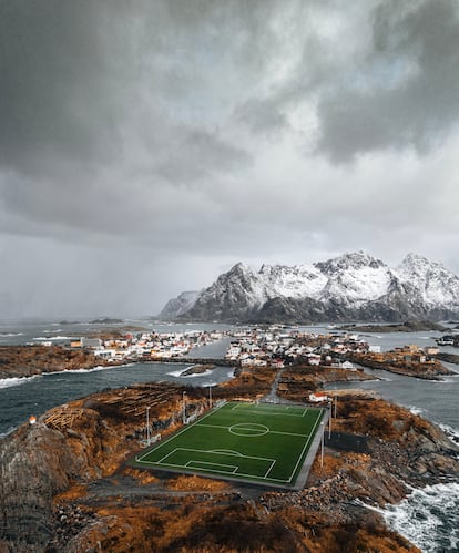 Otro fútbol es posible. Y se practica, alejado de los multimillonarios focos del fútbol metropolitano, en lugares como esta cancha de la isla de Hellandsoya, en el archipiélago de las Lofoten, más allá del Círculo Polar Ártico. En este lugar de una belleza abrupta, con playas de arena blanca en las que solo es posible bañarse un par de semanas al año, se ha construido el que Gillard considera uno de los estadios más bellos del mundo. Para acceder a él, según explica el escritor británico, hay que “cruzar puentes y túneles, esperar junto a una cuneta el paso de autobuses comarcales infrecuentes y caminar sobre lechos de roca”. Una vez completado el periplo, al llegar a un puerto pesquero de unos 400 habitantes “que alberga una galería de arte contemporáneo donde antes hubo una factoría de caviar”, toca pasmarse al comprobar que alguien haya creado algo tan bonito sobre un agreste lecho de lava petrificada para que los lugareños puedan jugar a fútbol bajo el sol de medianoche o de la aurora boreal.