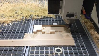 En Métrica Mínima huele a serrín, pero trabajan con el láser. “Usamos las nuevas tecnologías porque los tiempos cada vez son más ajustados, pero no hemos perdido el trabajo manual porque las piezas en 2D hay que ensamblarlas y las 3D también hay que afinarlas”, explica Diego Hernández. Frente a la mesa de carpintero impoluta donde descansan las herramientas manuales, una máquina CNC –de control numérico dirigida por el ordenador– corta, horada y busca la forma escondida en el taco de madera. Tiene la orden de reproducir una de las fachadas del Prado. En la pared de enfrente cuelga la segueta, rodeada del resto de utensilios. Espera su oportunidad en el banquillo. Eran otros tiempos, eran otras tecnologías. Quizás otras maquetas. Pero el oficio es el mismo, una mezcla de imaginación, juego y desarrollo técnico.