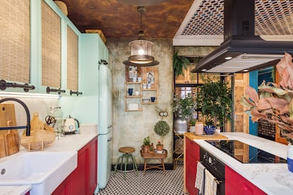 El techo de la cocina se revistió de dos trampantojos: un vinílico de la firma Coordonne con efecto geométrico inspirado en los mosaicos murales y una pintura que imita el óxido como si fuera una plancha de metal. En la pared quiso crear la ilusión de un cemento envejecido con matices verdosos y ocres y zonas desgastadas que simularan el paso del tiempo. “Mi idea fue romper la perfección de los muebles de la cocina con una superficie que aportara historia y contara con los frentes en colores tan vibrantes como el rojo inglés y el verde agua. Es una cocina nueva pero el trampantojo hace que parezca un espacio con alma. Aporta profundidad, textura y carácter y refuerza la idea de hogar ecléctico, entre lo industrial y a la vez nostálgico”, explica Lahoz.