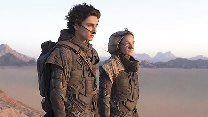En la novela, el destiltraje, que se lleva bajo “las amplias ropas del desierto” y la capa Jubba antirreflectante, tiene una brillante y crujiente superficie, cubre la frente, incluye un filtro que se porta sobre el rostro y posee correas de ajuste que hay que apretar para evitar roces. Se lleva con botas del desierto a juego. Con él no pierdes más de un dedal de humedad al día. Con esta descripción pides un destiltraje en Mango y ves a saber qué te dan. David Lynch en su machacado Dune de 1984 plasmó el destiltraje como un mono acolchado, adelantándose varias temporadas a la omnipresente parka de Uniqlo. El destiltraje masculino de Lynch incluye chocolatines abdominales y suspensorio marcapaquete, y que no falte nada en la galaxia. Bien puesto, como lo lleva Paul Atreides (Kyle MacLachlan, ¡esa barbilla!), permite moverte con la soltura suficiente como para vencer en duelo mortal al requetemalvado Feyd Rautha (Sting, ¡ese todo!), que en su uniforme de combate Harkonnen, digno de Rammstein en una noche loca, enfatiza también la parte contratante. En el Dune de Villeneuve, el destiltraje sigue la misma idea (el mismo patrón: voilà la tendencia) pero con más complementos como si dijéramos. Desconcertantemente o en una sutil referencia a la moda unisex, el destiltraje de Chani (Zendaya) también marca paquete. Al Stilgar de Javier Bardem parece quedarle un poco apretado en los bajos, quizá por eso está siempre con cara de mala leche.