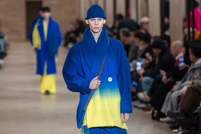 La melancolía planeó sobre otros desfiles de la semana, como el del italiano Magliano, que debutó en París con sus interesantes prendas cotidianas con efecto sucio y vapuleado, y portadas con parsimonia por modelos diversos con aire afligido. También estaba pensativo Yohji Yamamoto, el respetadísimo pope de la moda japonesa. Sus modelos, hombres de todas las edades y cuerpos, iban vestidos con voluminosos derivados de la casaca y la ropa militar sobre una pasarela con dos punching balls. Al pasar, cada uno hacía lo que prefería: le daba un puñetazo, una caricia, un beso o se inclinaba ante ella con respeto.