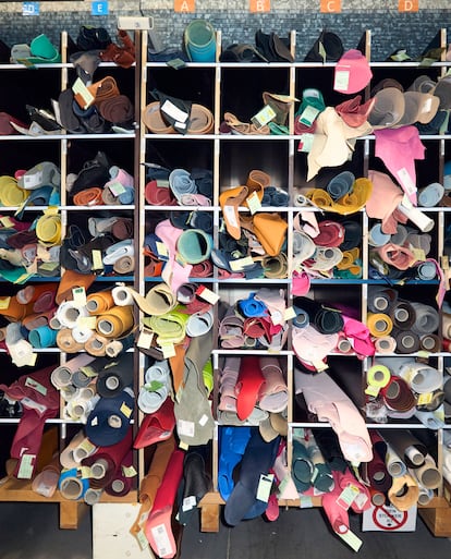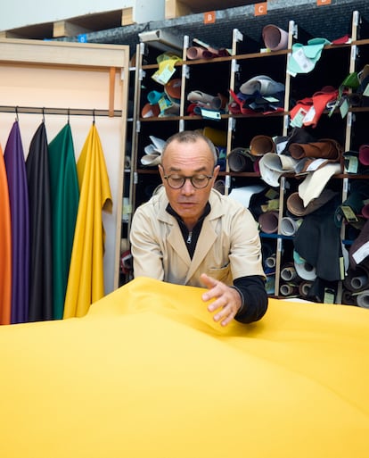 El taller de Ducey cuenta con 800 artesanos, pero todo empieza siempre con las manos de Jean-David. “Yo puse la primera piedra de este taller, había un ambiente muy familiar”, recuerda. A sus 58 años, lleva 30 trabajando para la maison y, en 2001, formó parte del equipo fundador del taller. Por él han pasado casi todas las colecciones: Jean-David se dedica al control de calidad de los materiales y ha sentado los estándares para el resto de talleres. Trabaja entre paredes abarrotadas de bobinas de cuero de las que certifica el color, el grosor y la textura requeridos por cada diseñador. Desde que Pharrell recuperó el modelo en 2023, se ido acostumbrando a los colores saturados y las formas acolchadas del P9.