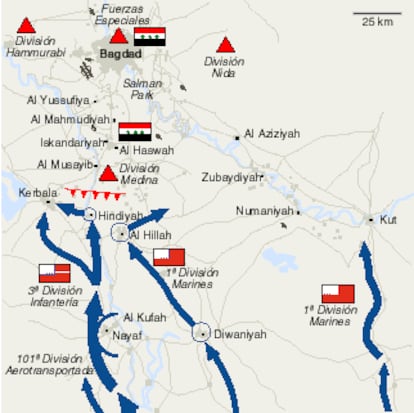 En su avance hacia Bagdad, las tropas aliadas tendrán que hacer frente también, cerca de Nayaf, a las unidades de la Guardia Republicana apostadas en Karbala (unos 100 kilómetros al sur de la capital), escenario de duros enfrentamientos en días pasados. Según algunos militares estadounidenses, esta batalla podría ser "decisiva".