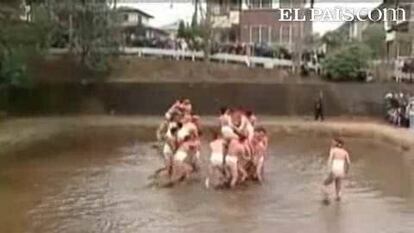 Decenas de japoneses se han zambullido en una charca a las afueras de Tokio para continuar con una antigua tradición convertida hoy en todo un evento turístico. Se trata de una fiesta en la que sólo participan hombres vestidos con el atuendo típico de los luchadores de sumo, es decir, nalgas al aire y genitales cubiertos. Los participantes se meten en el agua helada y se embadurnan de fango.Vídeo: AGENCIA ATLAS