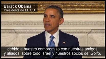El presidente de Estados Unidos, Barack Obama, ha defendido la vía diplomática y pacífica por la que apostó cuando llegó a la Casa Blanca como el camino que ha permitido lograr el ansiado acuerdo para limitar el programa nuclear iraní al que se llegó en Ginebra durante la madrugada del domingo. Minutos después de que se anunciara el compromiso, el mandatario compareció para destacar la importancia de un pacto que es el primer paso para reducir la capacidad de que Irán tenga una bomba nuclear. Obama ha explicado las líneas generales del tratado y ha instado al Congreso de su país a que no autorice nuevas sanciones para poder cumplir con las promesas que los cinco miembros permanentes del Consejo de Seguridad, más Alemania, acordaron con Teherán.