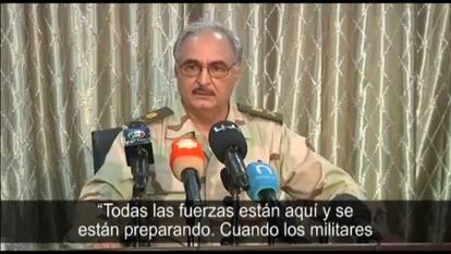 El coronel Mojtar Farnana fue el que comunicó por la televisión libia el domingo que un grupo encabezado por el general retirado Jalifa Hifter había entrado por la fuerza en la capital para autoproclamar una Asamblea Constituyente de 60 miembros para remplazar al Parlamento y poner en marcha otra Constitución. También informó de que el objetivo de esas fuerzas leales a Hifter, en esta autodenominada Operación Dignidad, es evitar que los partidos islamistas dominen el poder político y permitan la infiltración de grupos terroristas próximos a Al Qaeda. El general retirado al mando del golpe recibió este lunes el respaldo de los mandos de la base aérea de Tobruk (en el este del país) y del comandante de las fuerzas especiales de Bengasi. Y negó estar encabezando un golpe. Focalizó sus enemigos en los grupos islamistas armados Al Qaqaa y Al Sawaeq, que dominan Bengasi, la segunda ciudad del país, contra los que dirigió sus ataques del viernes y el sábado.