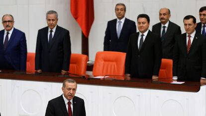 "En mi capacidad de presidente de la República, juro por mi honor y reputación ante la gran nación turca y ante la historia salvaguardar la existencia e independencia del Estado", ha afirmado Erdogan, de 60 años, al prestar juramento. El nuevo presidente, que sucede a Abdulá Gül, ha prometido respetar "la Constitución, la supremacía del derecho, la democracia, los principios y las reformas de [Mustafá Kemal] Atatürk y los principios de la República laica" fundada por este último en 1923 sobre las ruinas del Imperio Otomano.