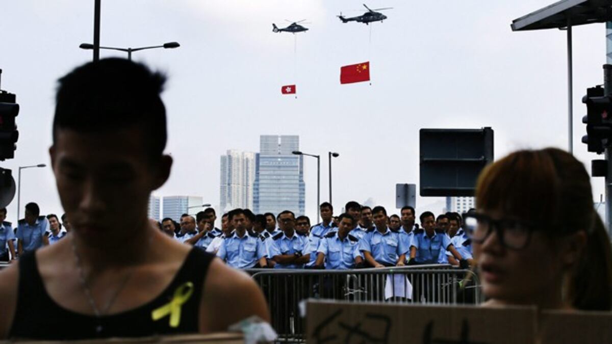 La “revolución de los paraguas” -el objeto que emplearon los manifestantes para repeler las cargas policiales con gas lacrimógeno el domingo y que se ha convertido en símbolo de las protestas- sigue en pie. Este martes volvían a reunirse en las calles en torno a la sede del gobierno autónomo decenas de miles de personas, cerca de 100.000 según los organizadores. La breve tormenta que cayó a última hora de la tarde no logró descorazonarles: si algo abunda en la manifestación es, precisamente, paraguas.