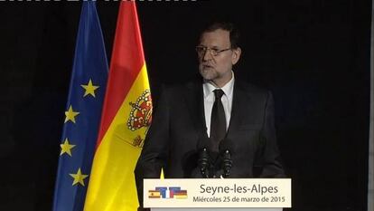 Es probable que los tres mandatarios nunca se hubieran encontrado en un lugar tan inhóspito como el aeródromo de Seyne-les-Alpes. Con un frío helador, rodeado de picos aún nevados, Hollande, Merkel y Rajoy han llegado al lugar hacia las dos de la tarde. El miedo de Rajoy a viajar en helicóptero ha impedido que los tres mandatarios sobrevolaran la zona de la tragedia. Solo se acercaron en coche a un lugar próximo. La ministra española de Transportes, Ana Pastor, sí observó el lugar desde el aire el día anterior. “Está todo en mil pedazos. Mejor no describirlo”, explica.