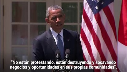 El presidente dijo no encontrar “excusa” para “la violencia sin sentido” registrada en Baltimore y aseguró que los responsables de los disturbios serían tratados “como criminales”. “Eso no fue una protesta. Eso no fue una manifestación”, declaró el mandatario. “Fue un puñado de gente que se aprovechó de una situación para sus propios motivos”. Obama descartaba así que los que quemaron coches y centros sociales y saquearon comercios entraran en la categoría que definió Martin Luther King hace más de medio siglo. “Los disturbios son el lenguaje que usan aquellos que no son escuchados”.