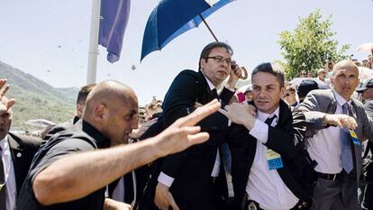 La ceremonia del vigésimo aniversario de la masacre de Srebrenica, a la que acudieron este sábado decenas de miles de personas, se vio ensombrecida por una agresión al jefe del Gobierno serbio, Aleksandar Vucic, el primer mandatario de su país en asistir al homenaje anual. El político serbio acudió al Centro Memorial de Potocari (cerca de Srebrenica), donde depósito unas flores, y a la salida la multitud empezó a abuchearle y a tirarle objetos, según las imágenes de la televisión pública bosnia. Vucic fue alcanzado en la cabeza por varias pedradas. La policía local informó de que una persona había sido detenida por el incidente.