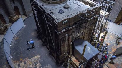 El destartalado templete que guarda la tumba de Cristo dentro de la basílica del Santo Sepulcro de Jerusalén ha comenzado por fin a ser restaurado. Tras décadas de disputas, las tres principales confesiones cristianas que guardan el santo lugar -católicos, ortodoxos y armenios- se han puesto de acuerdo para abordar una reforma integral de la también conocida como “la casita”, el pequeño templete que protege la lápida que, según la tradición cristiana, recuerda el lugar exacto donde fue enterrado Jesucristo, así como su antesala, la Capilla del Ángel.