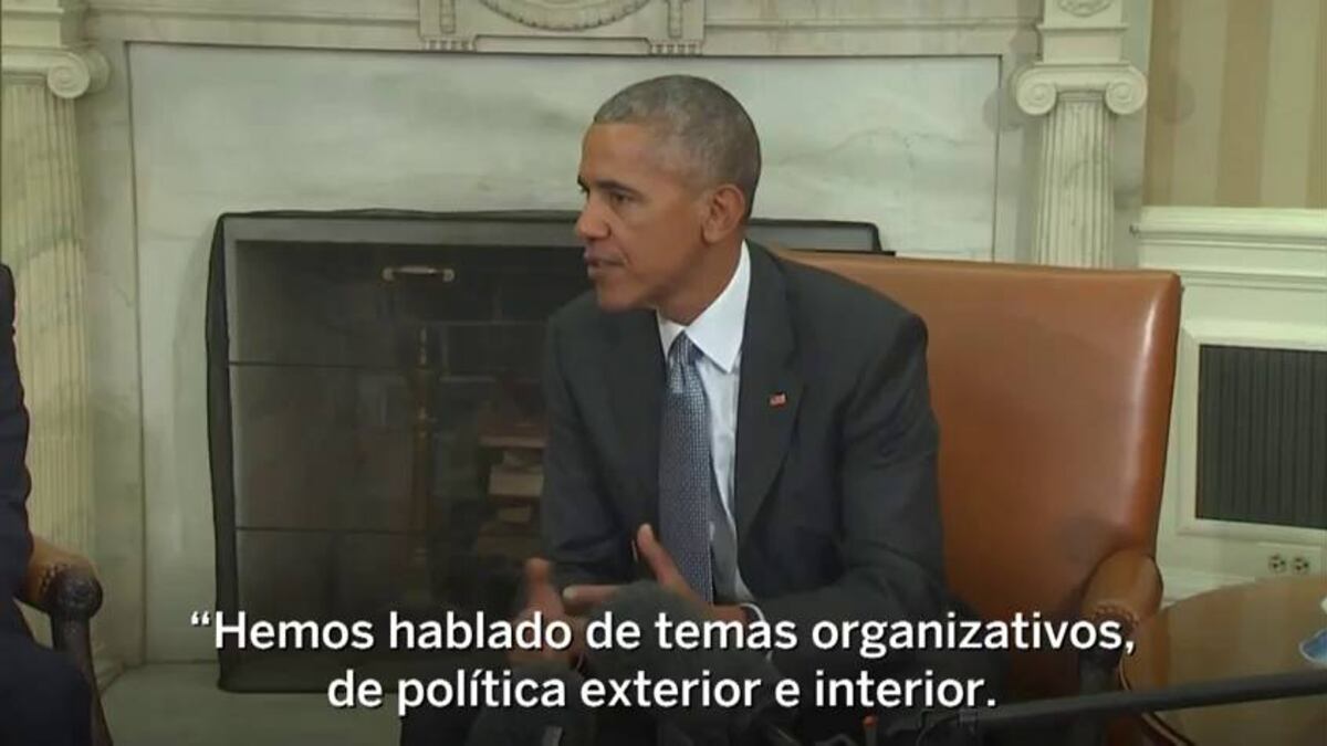 “Mi prioridad número uno en los próximos dos meses será facilitar una transición que garantice que nuestro presidente electo tenga éxito”, dijo Obama. “Y me ha alentado, creo, el interés del presidente electo Trump en querer trabajar con mi equipo sobre los muchos asuntos que este gran país afronta. Y creo que es importante para todos, independientemente del partido y de las preferencias políticas, que nos unamos, que trabajemos juntos, que afrontemos los muchos desafíos que tenemos enfrente”.