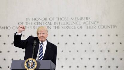 Donald Trump cargó este sábado contra la prensa en su primera comparecencia pública como presidente de Estados Unidos. Lo hizo entre aplausos, en un territorio sagrado para los servicios de inteligencia estadounidenses: la sede de la CIA, frente al muro de mármol donde están grabadas 117 estrellas en memoria de los empleados de la agencia de espionaje muertos en acto de servicio. El nuevo comandante en jefe, que hace unas semanas comparó las prácticas de la CIA con las de la Alemania nazi, acusa a los medios de dar la impresión de que existe un enfrentamiento entre él y los espías estadounideneses, y sostiene erróneamente que mintieron sobre la asistencia a la jornada inaugural, el viernes.