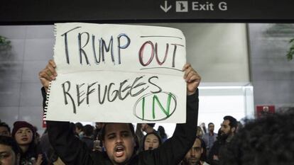 - El veto ha provocado protestas en el aeropuerto neoyorquino JFK y en otros puntos del país como Washington, Chicago, Minneapolis, Denver, Los Ángeles, San Francisco y Dallas. "Déjenles entrar", "Todos son bienvenidos aquí" o "Esto es ilegal" son algunas de las pancartas que podían verse en la concentración en el aeropuerto neoyorquino, respaldada por varios grupos de derechos civiles y de protección de los inmigrantes.