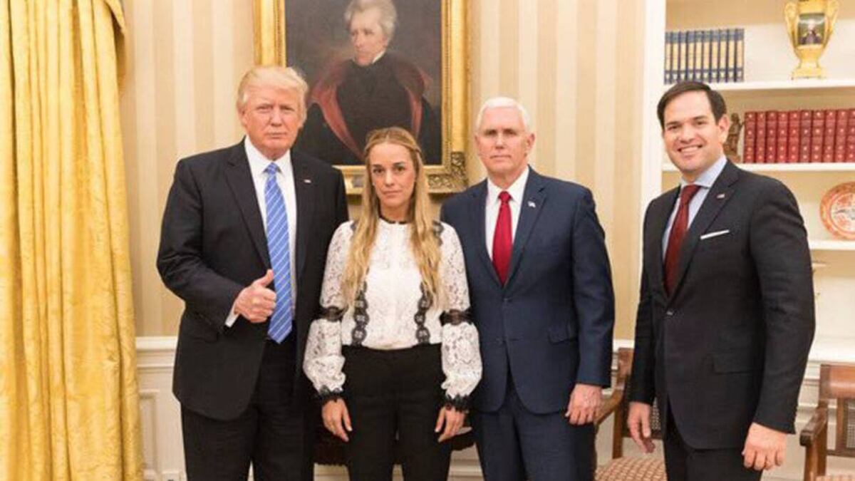 “Venezuela debería permitirle a Leopoldo López, un prisionero político y esposo de Lilian Tintori, salir de prisión de forma inmediata”, ha tuiteado el presidente estadounidense. Además de Trump y Tintori, en la foto posan el vicepresidente, Mike Pence, y el senador republicano Marco Rubio.