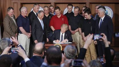 EE UU dice adiós a una de las piezas clave del legado de Obama y da la bienvenida a “una nueva revolución energética”, en palabras de Trump. “Se ha acabaron los abusos del gobierno federal”, dijo el presidente. “Se trata de recuperar los puestos de trabajo, volver a cumplir sueños y hacer que América sea rica de nuevo”. La Administración republicana argumenta que el demócrata llevó a cabo una “guerra contra el carbón” y “despreció a los trabajadores” con sus políticas.