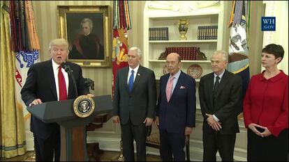 Después de que el vicepresidente dirigiera unas palabras a los medios, le llegó el turno a su jefe. Se acercó al atril y en un brevísimo discurso, calificó las órdenes de “muy especiales” y prometió “resultados muy, muy pronto”. Luego, sin rubricar los decretos, se dirigió a la puerta de salida, mientras un periodista le preguntaba en voz alta sobre la petición de inmunidad solicitada por el exconsejero de Seguridad Nacional, Michael Flynn, para comparecer ante los comités de inteligencia del Congreso.