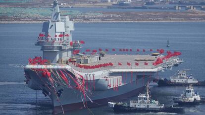 China ha presentado oficialmente su primer portaaviones de fabricación nacional, y el segundo de su flota, este miércoles, en medio de fuertes tensiones en la península coreana en torno al programa de armamento del régimen de Kim Jong-un. El buque, que según han adelantado medios locales quedará bautizado como Shandong, se botó en una ceremonia por todo lo alto en el puerto de Dalian, en el noreste del país. De 315 metros de largo por 75 de ancho, el portaaviones desplaza 50.000 toneladas y alcanzará una velocidad de crucero de 31 nudos (alrededor de 60 kilómetros por hora), según ha indicado la agencia de noticias china Xinhua. El buque, la gran joya de la corona de las fuerzas armadas chinas y que tendrá una tripulación de mil personas, no está aún terminado: aún es necesario completar su equipamiento interior y sus motores, así como dotarlo de armamento. No se espera que entre en servicio hasta 2020.