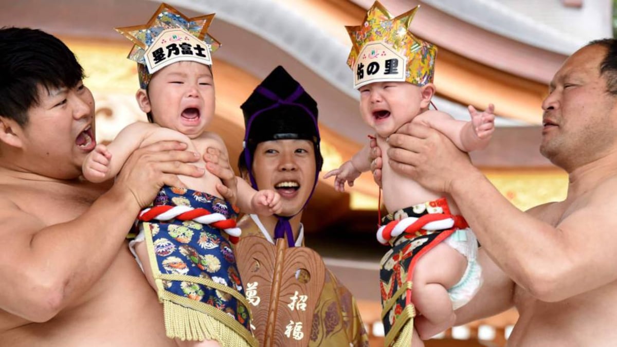 Dos bebés llorando enfrentados el uno al otro y sostenidos por una pareja de sumos forzudos. Esta ceremonia, que se celebra por todo Japón desde hace cuatro siglos, es una práctica extendida entre la población del país asiático. El pasado domingo 14 de mayo, más de cien retoños se dieron cita en el recinto de sagrado Kamegaike Hachimangu en la localidad de Sagamihara, al oeste de Tokio. "Mi pequeño ha llorado desde el principio y me he sentido un poco mal", relató a AFP Tomoyo Watanabe, madre de Zentaro. "Pero en cuanto vi que lloraba supliqué por él para que pueda crecer sano y fuerte", añadió.