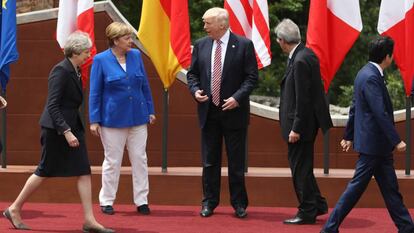 La sensación en el arranque de la 43ª edición del G7 —blindada por tierra, mar y aire con 10.000 hombres— era la del fin de una prolífica era de acuerdos y el inicio de un insondable orden construido sobre intereses unilaterales. Muchas novedades sobre la mesa, pocas esperanzadoras. Una cumbre que llega demasiado pronto para unos, y en medio de un proceso electoral para otros. Debutaban cuatro mandatarios Emmanuel Macron, Paolo Gentiloni, Theresa May y Donald Trump. Y los focos se dirigieron principalmente a la británica —por primera vez representó en el G7 a un Reino Unido con un pie fuera de la Unión Europea— y al presidente de EE UU. Aislado por su propia visión del mundo —incluso físicamente en los paseos que realizaron los mandatarios por Taormina—, el liderazgo de EE UU en el G7 quedó voluntariamente diluido en Taormina.
