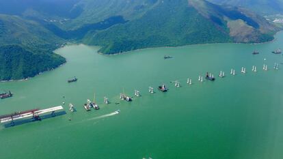 Se miren por donde se miren, las cifras del viaducto sobre el mar más largo del mundo que unirá por carretera la ciudad de Hong Kong con Macao y Zhuhai, en el sur de China, no dejan a nadie indiferente: 55 kilómetros de longitud a base de puentes, túneles submarinos y una isla artificial erigida en mitad de las aguas; 400.000 toneladas de acero utilizadas en su construcción, 60 veces la cantidad que se necesitó para levantar la torre Eiffel de París; y más de 16.000 millones de euros de presupuesto convierten a esta monumental obra de la ingeniería civil en uno de los proyectos más complejos jamás ejecutados por la mano del hombre.